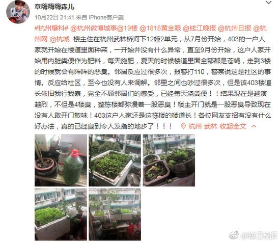 家住武林橋河下12幢2單元的網友@章嗨嗨嗨森兒 爆料:從7月份開始,同幢樓的一戶人家就開始在樓道里種菜,一開始并沒有什么異常,直至9月份開始,這戶人家開始用內臟糞便作為肥料,每天施肥,夏天的時候樓道里面全部都是蒼蠅,走到3樓的時候就會有陣陣惡臭?,F在更是越演越烈,不但是4樓臭,整棟樓都彌漫著一股惡臭!目前,多次協調未果,爆料網友已經崩潰了!