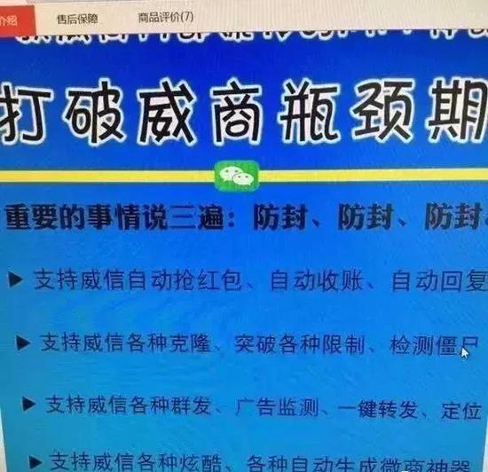 賣家在這款軟件介紹里號(hào)稱:“支持微信自動(dòng)搶紅包、自動(dòng)收賬、自動(dòng)回復(fù);支持各種克隆、突破各種限制、檢測(cè)僵尸;支持各種群發(fā)、廣告監(jiān)測(cè)、定位……”