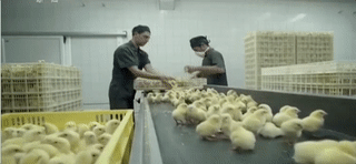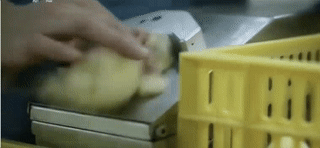 工廠化養殖的小雞不是在雞窩里孵化,而是通過孵化器孵化出來。在小雞能夠站立起來時,就會被分揀、打包送到巨大的飼養場里。