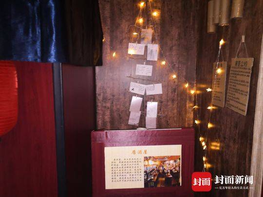 6日下午,為了一探究竟,記者來到這間寢室。一推開門,記者就被眼前的景象所吸引,只見寢室內有四個床位,上面是深色的蚊帳,下方是貼著壁紙的桌柜。宿舍的墻上和床鋪之間,用一些燈具和飄帶串聯起來,地上擺放著一只小圓桌,桌上放著一個酒壺和杯子,加上和煦的燈光。嘿,你別說,看起來還真有幾分日本動漫中居酒屋的味道。