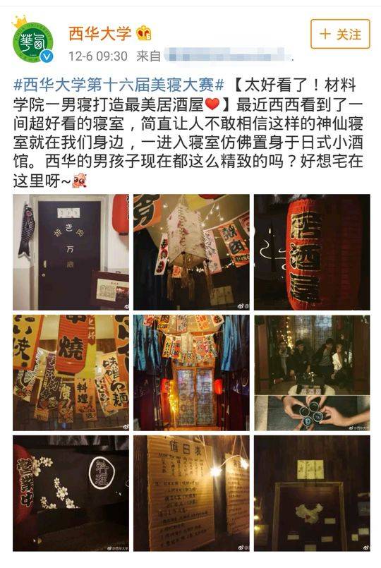 圖片中,幾名男生正笑著坐在地上,看著宿舍墻上的地圖,一旁是飄著的鯉魚旗,再加上柔和的燈光和一些日文字,儼然一家極具溫暖色彩的日式小酒館模樣。該校官微轉發稱,“簡直讓人不敢相信這樣的‘神仙寢室’就在我們身邊,現在的男孩子都這么精致的嗎?”