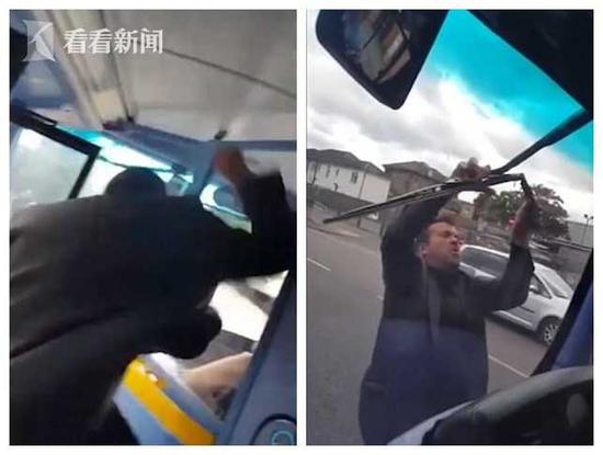 男子沖到駕駛室邊上,用拳頭瘋狂地砸玻璃,還隔著玻璃朝司機猛吐口水。見無法進入駕駛室攻擊自己的目標,男子拎著東西走下車,來到車頭另一側,準備從另一扇窗戶擊打司機。司機眼疾手快將玻璃關上。男子氣急敗壞,走到車前用巴掌拳頭猛砸玻璃,最后竟歇斯底里地將兩個雨刮器全部掰壞。感覺還不解恨,男子又拿出一大瓶飲料往擋風玻璃上潑,潑完了又拿空瓶子砸玻璃。