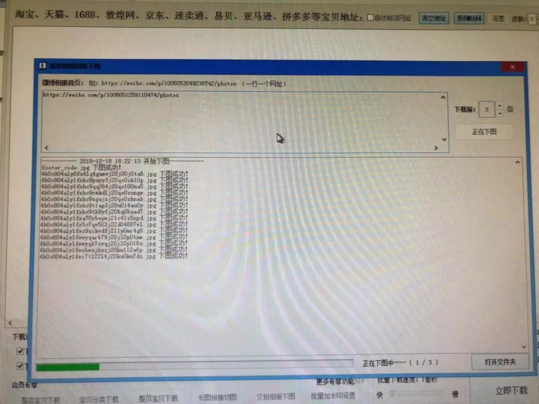 在這類軟件中,只要輸入微博用戶的相冊網址,就可以將其圖片“一網打盡”。我們以一位知名女明星的微博為例,只要輸入其相冊的鏈接,就可以自動下載相冊里的所有圖片。此外,用戶還可以自由選擇要抓取微博用戶圖片的數量:比如說,在軟件中輸入“抓取1-3頁圖片”的選項,軟件就會自動將該女明星微博相冊中前三頁的圖片“一網打盡”。