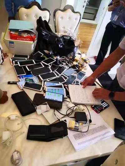 根據(jù)中國(guó)警方提供的視頻資料,在新城國(guó)際的辦案現(xiàn)場(chǎng),有幾十條長(zhǎng)桌子分列辦公室的兩側(cè),每條長(zhǎng)桌子能坐兩排人,每排坐7-10個(gè)員工。長(zhǎng)桌子堆滿了耳機(jī)、排插、打火機(jī)、保溫杯、香煙和有中文字樣的常用藥,以及詐騙團(tuán)伙統(tǒng)一配備的電腦和手機(jī)。