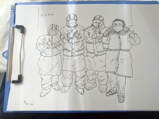 他把畫的“方艙生活”發到了微博上——兩位病人在床,護士俯身照顧。畫中醫院的墻上被他特意寫了四個字:“武漢加油。”