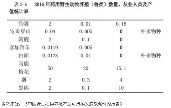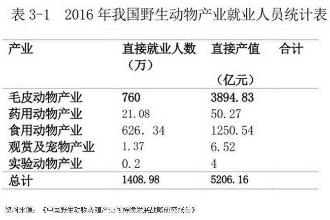 根據調查估算,2016年,全國野生動物養殖產業的專兼職從業者有1409多萬人,創造產值5206多億元人民幣。其中,毛皮動物產業從業者約760萬人,毛皮產業產值估算3894.83億元;藥用動物產業的從業者約21.08萬人,創造產值50.27億元;食用動物產業的從業者約626.34萬人,創造產值1250.54億元;觀賞、寵物類產業的從業者約1.37萬人,創造產值6.52億元;實驗靈長類動物產業直接從業者約2000人,創造產值4億元。