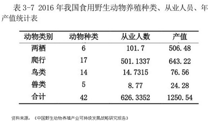 據估算,2016年我國食用動物產業的直接從業者約626.34萬人,總產值1250.54億元。其中兩棲爬行類養殖從業人員101.7萬人,年產值506.48億元。爬行動物養殖從業人員501.13萬人,年產值643.22億元。鳥類養殖從業人員14.73萬人,年產值76.56億元。獸類養殖從業人員8.77萬人,年產值24.28億元。