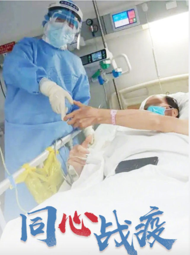 武漢隔離病房內的醫患比心照