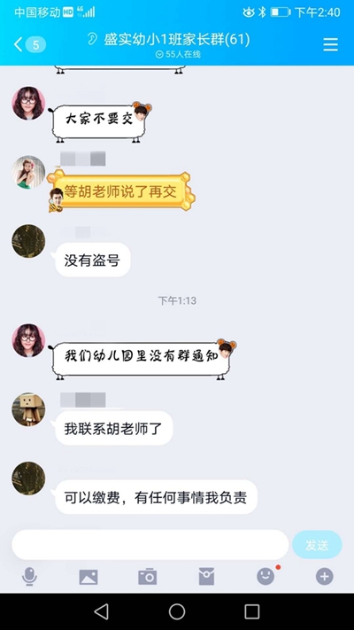 期間,有家長不放心河南收款方,直接給劉老師打電話確認,劉老師表示,從未發過通知。這位家長立刻通知群里其他家長:這是騙子,不要再轉賬。