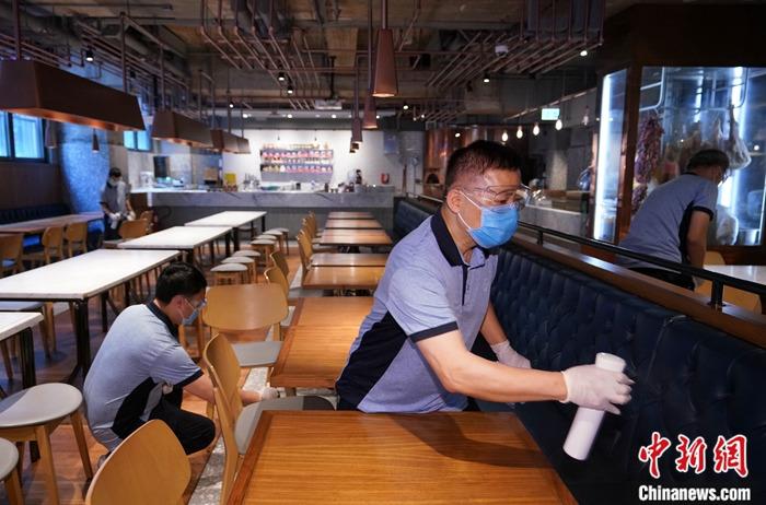 資料圖:工作人員為蘭桂坊一家餐廳噴灑光觸媒消毒劑。中新社記者 張煒 攝
