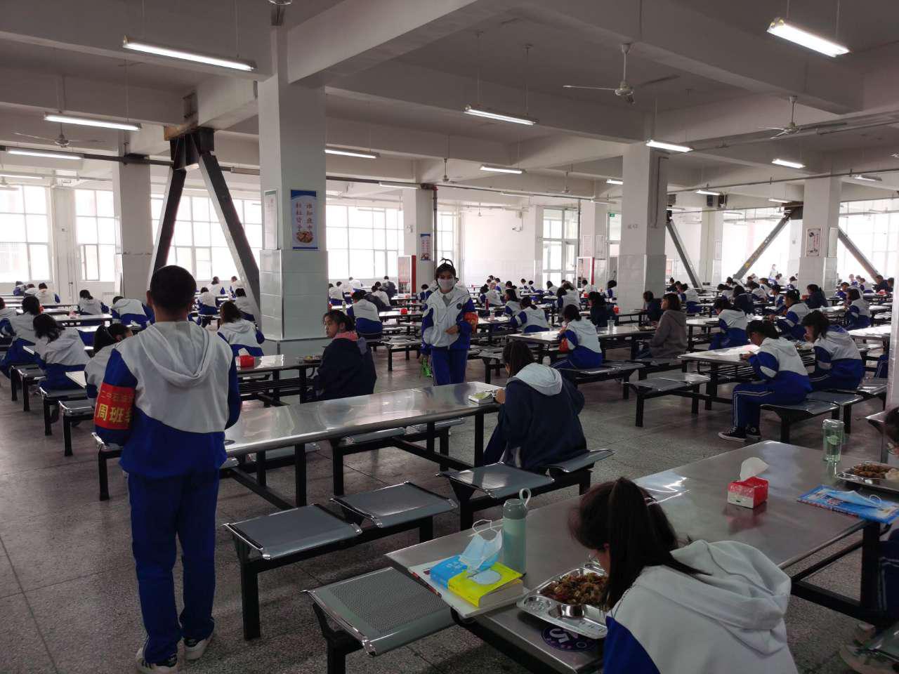 “8人座的大餐桌只能坐兩個人,還是各年級錯峰吃飯,跟以前習慣的飯點不一樣了有點不習慣,但是感覺很安全。”就餐是學校防疫措施中的重要一環,太原市第五中學的教師介紹,就餐時會將學生分為A班和B班錯峰就餐,并且每位學生的就餐位置都是固定的,學生找到自己的名字,同向就坐。