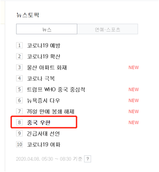 韓國最大搜索網站NAVER:“中國武漢”熱搜第8
