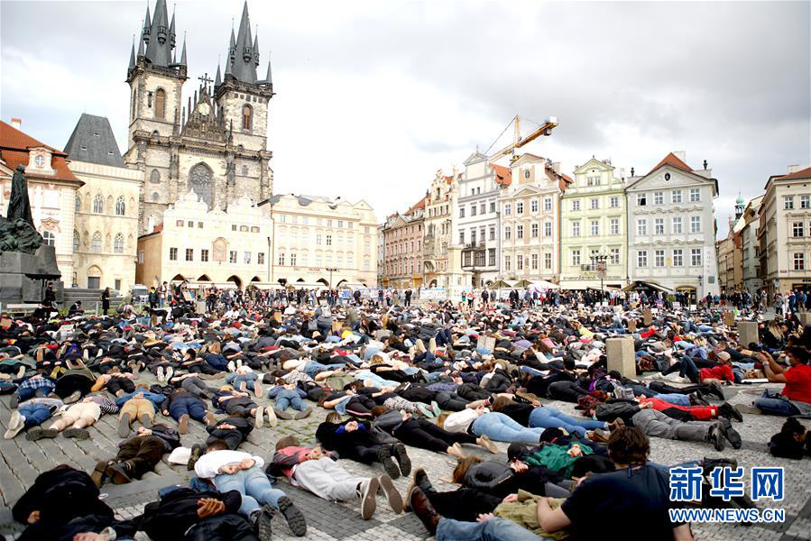 當地時間6月6日,在捷克首都布拉格,示威者模仿美國非裔男子弗洛伊德受害時的樣子。數百名示威者6日聚集在捷克首都布拉格的老城廣場,抗議在美國發生的針對非洲裔群體的種族歧視行為。
