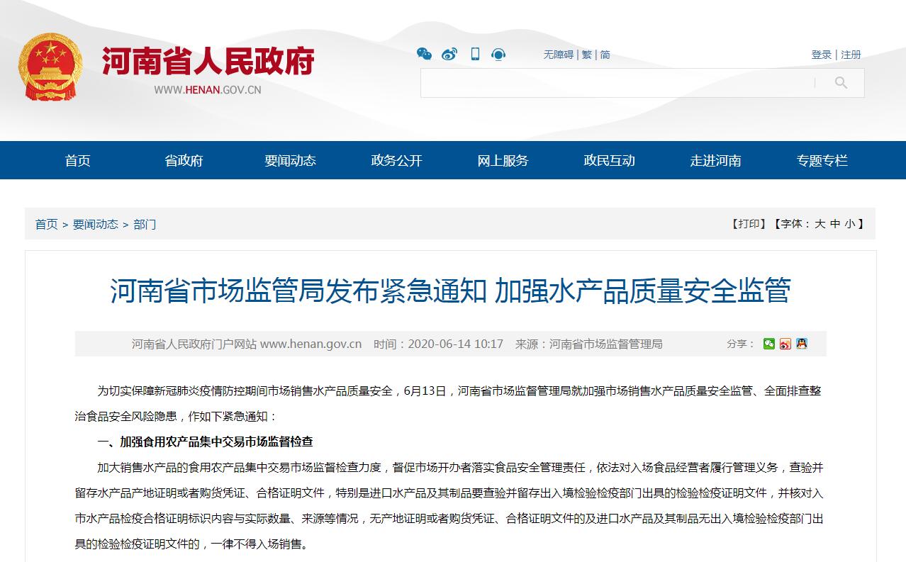 6月13日,河南省市場(chǎng)監(jiān)管局就加強(qiáng)市場(chǎng)銷售水產(chǎn)品質(zhì)量安全監(jiān)管、全面排查整治食品安全風(fēng)險(xiǎn)隱患發(fā)布緊急通知。