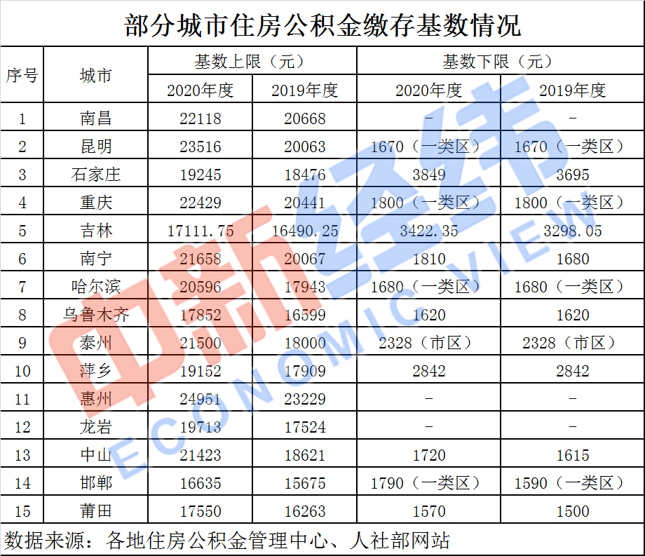 2020年度住房公積金繳存基數最高為19245元,最低為3849元。分別較上年度增加769元和154元。
