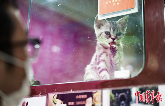北京三里屯一寵物店內,一位顧客正在觀察小貓洗臉。