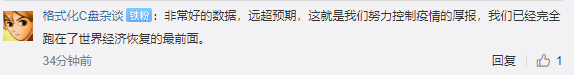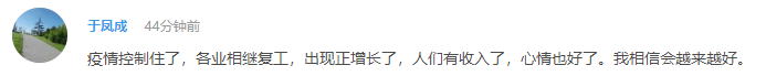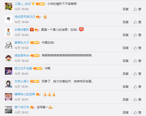 網(wǎng)友表示,數(shù)據(jù)表明中國經(jīng)濟打不垮,有很強的韌性和戰(zhàn)略縱深。也有細心的網(wǎng)友反映,最近市場繁榮不少,發(fā)現(xiàn)公路上拉煤車,拉貨車不少。還有網(wǎng)友說,疫情控制住了,各業(yè)相繼復(fù)工,出現(xiàn)正增長了,人們有收入了,心情也好了。我相信會越來越好。