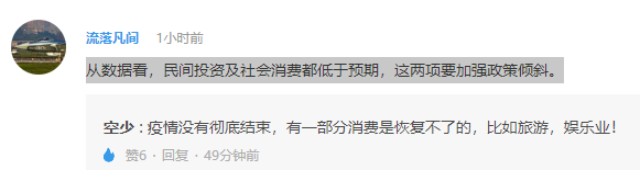 有網(wǎng)友建議,經(jīng)濟尚未完全恢復(fù),旅游業(yè)才起步,餐飲服務(wù)業(yè)經(jīng)營恢復(fù)七、八成,產(chǎn)業(yè)鏈上下游還待對接。也有網(wǎng)友說,從數(shù)據(jù)看,民間投資及社會消費都低于預(yù)期,這兩項要加強政策傾斜。還有網(wǎng)友提出,GDP數(shù)據(jù)轉(zhuǎn)正后,希望進一步提高經(jīng)濟發(fā)展的質(zhì)量。