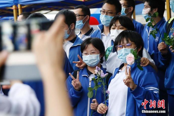 資料圖:7月10日,北京第八十中學(望京校區)高考考點外,北京朝陽外國語學校的考生們合影。當日,為期4天的北京地區2020年高考結束。 中新社記者 韓海丹 攝