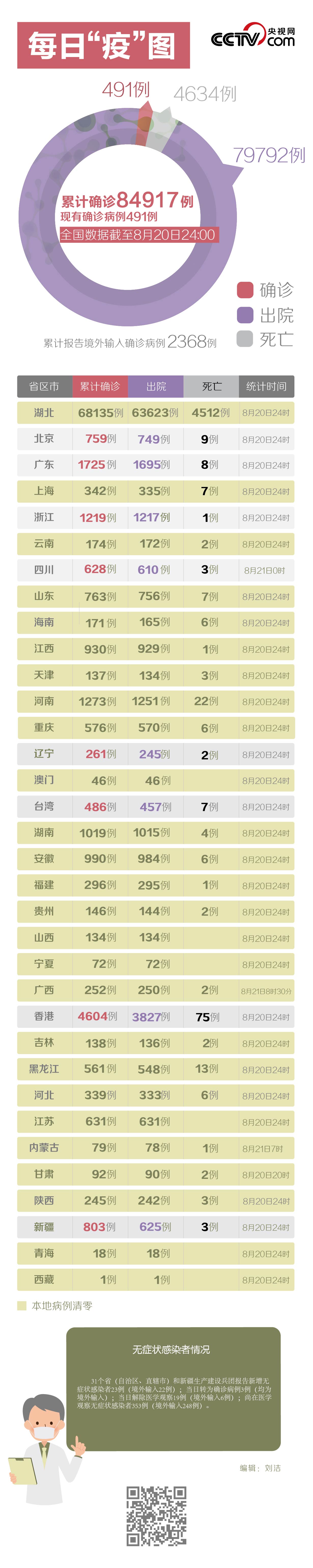 央視網(wǎng)消息:截至8月20日24時(shí),31個(gè)省(自治區(qū)、直轄市)和新疆生產(chǎn)建設(shè)兵團(tuán)報(bào)告新增無癥狀感染者23例(境外輸入22例);當(dāng)日轉(zhuǎn)為確診病例3例(均為境外輸入);當(dāng)日解除醫(yī)學(xué)觀察19例(境外輸入6例);尚在醫(yī)學(xué)觀察無癥狀感染者353例(境外輸入248例)。