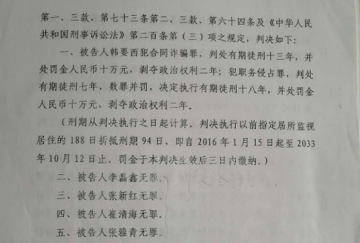 2017年6月19日,航空港法院判決韓要西犯合同詐騙罪、職務侵占罪、虛假訴訟罪,數罪并罰,決定執行有期徒刑二十年,并處罰金十一萬元,法院還判令其向十三名/家被害人/被害單位退賠5654.43萬元,其中含張新紅、張雅青等人的2604.64萬元。