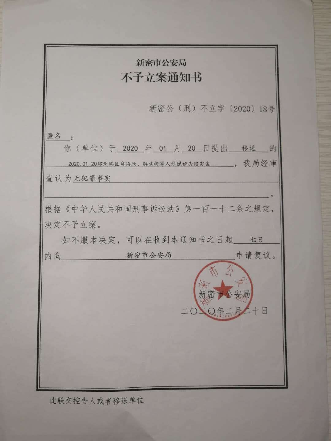 此后,該案被鄭州市公安局指定由新密市(鄭州下轄縣級市)公安局查辦。2020年2月20日,新密市公安局作出的不予立案通知書顯示,“2020年1月20日移送的鄭州港區贠得欣、解慧梅等人涉嫌誣告陷害案,我局經審查認為無犯罪事實,根據刑訴法第一百一十二條之規定,決定不予立案。”