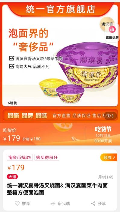 統一則推出湯達人升級版本“極味館”,6杯整箱價格59.9元;“滿漢大餐”系列價格則“更上一層樓”,2碗39.8元,“滿漢宴”骨湯叉燒面6碗179元。