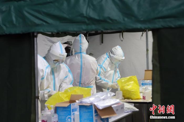 11月21日,受新冠肺炎疫情影響,天津市濱海新區(qū)對(duì)轄區(qū)內(nèi)全體居民進(jìn)行大規(guī)模核酸檢測(cè)篩查。圖為核酸檢測(cè)取樣現(xiàn)場(chǎng)忙碌的醫(yī)務(wù)工作者。 中新社記者 張道正 攝