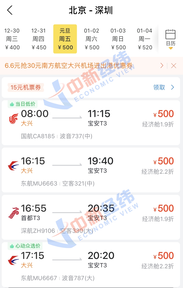 北京—深圳CA8185、MU6663、ZH9106、MU6667、ZH9108、ZH9110、MU6669等7架航班機(jī)票價(jià)格為500元,兩地間高鐵二等座需944.5元,部分航班機(jī)票價(jià)格比兩地高鐵二等座價(jià)格便宜近一半。此外,還有22架航班價(jià)格在530元—900元之間。