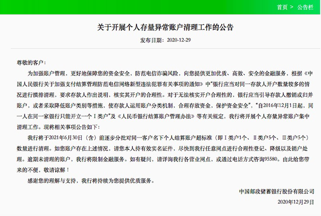 郵政儲(chǔ)蓄銀行公告顯示,將于2021年6月30日(含)前逐步分批對(duì)同一客戶名下個(gè)人結(jié)算賬戶超標(biāo)準(zhǔn)(即Ⅰ類戶1個(gè)、Ⅱ類戶5個(gè)、Ⅲ類戶5個(gè))數(shù)量進(jìn)行清理。如賬戶存在上述情況,本人持有效實(shí)名證件,盡快到該行任意網(wǎng)點(diǎn)進(jìn)行合理性登記、降級(jí)以及銷戶處理。逾期未清理的賬戶,該行將限制金融服務(wù)。