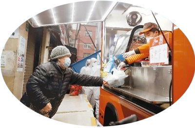 2021年1月24日,上海市黃浦區貴西小區被列為中風險地區,實施封閉管理。為了保障封閉小區居民的生活,經過社區、政府和企業的溝通協調,每天早上7點至9點,有一部早餐車停靠在小區的封閉隔離線外,為居民提供熱氣騰騰的健康營養早餐。圖為1月26日,在貴西小區的隔離線前,居民以無接觸的方式從餐車上購買早餐。