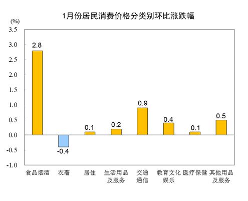 1月份,全國居民消費價格環比上漲1.0%。其中,城市上漲1.0%,農村上漲1.1%;食品價格上漲4.1%,非食品價格上漲0.3%;消費品價格上漲1.5%,服務價格上漲0.2%。