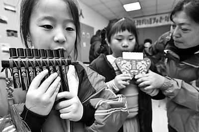 江蘇省揚(yáng)州市邗江區(qū)竹西街道竹西社區(qū)兒童在周末“第二課堂”公益托管班學(xué)習(xí)體驗(yàn)排簫吹奏技法。莊文斌攝/光明圖片