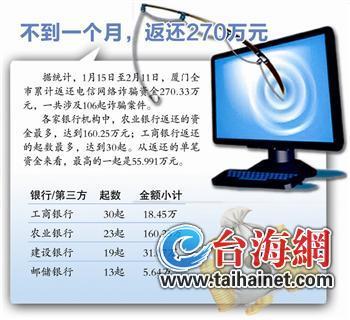 據(jù)介紹,不久前市反詐騙中心聯(lián)合廈門銀監(jiān)局、人民銀行廈門市中心支行、相關銀行和第三方支付機構,開展電信網(wǎng)絡詐騙資金返還工作。僅1月15日至2月11日,不到一個月就累計返還詐騙資金270.33萬。