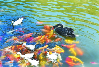 24日,位于連城縣冠豸山的石門湖,黑天鵝、白鴨和成群的錦魚(yú)湖中共舞,妙趣橫生,吸引眾多游客前來(lái)觀賞。 本報(bào)記者 林輝 攝
