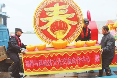 人們正將送給馬祖的花燈搬上輪船。