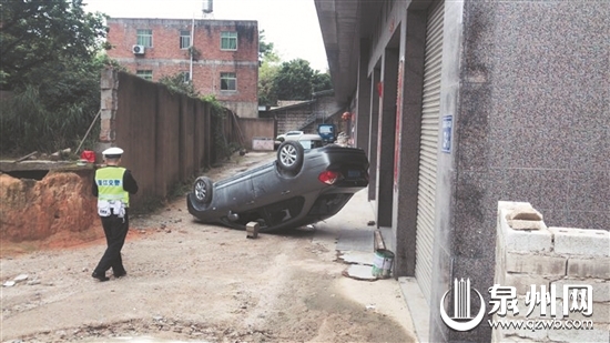 4月16日早上8時許,晉江交警接群眾報警稱,在磁灶嘉福村東環(huán)路,一輛灰色小轎車撞上村民家門口圍墻,翻了個底朝天,車頭損壞明顯,所幸無人員傷亡。