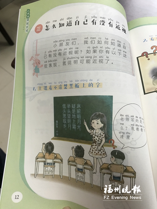 記者看到,小學一、二年級的讀本根據低年級孩子的特點,不僅用了拼音,而且語言風格通俗俏皮,圖文并茂。小學五、六年級的讀本,關于近視的原理等知識有了更多拓展,但都在小學生能理解接受的范圍內。