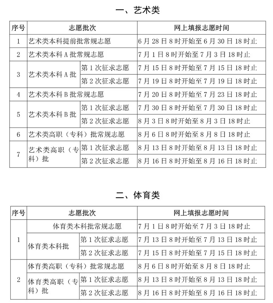 3.體育類。本科批常規志愿和征求志愿實行院校志愿平行投檔。高職(專科)批常規志愿和征求志愿均實行專業志愿平行投檔。