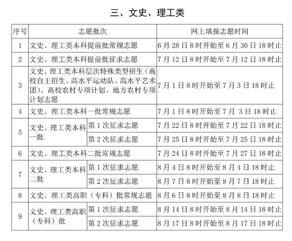 第七條 文史、理工類設本科提前批、本科一批、本科二批和高職(專科)批四個批次。