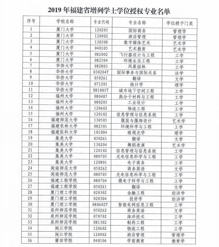 日前,福建省教育廳官網發布《福建省學位委員會關于公布2019年高校增列學士學位授權專業名單的通知》。
