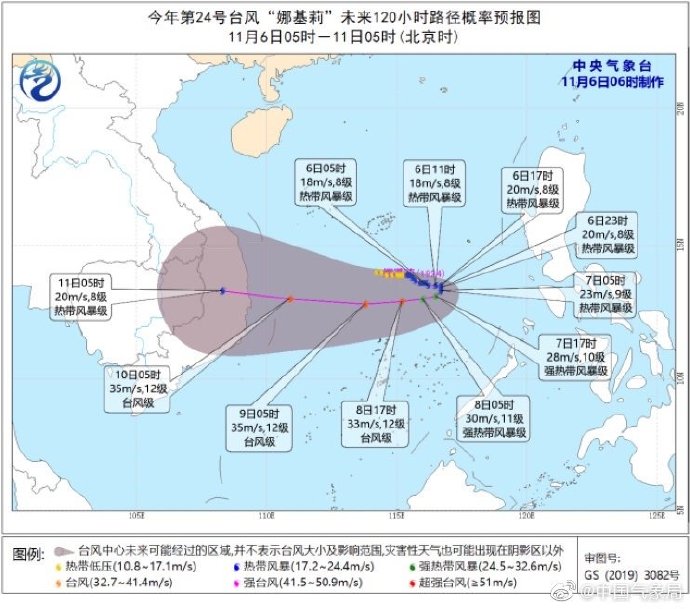 5日晚上8點鐘,南海熱帶低壓加強為今年第24號臺風“娜基莉”(熱帶風暴級,英文名稱:Nakri;名字來源:柬埔寨;名稱意義:一種花)。