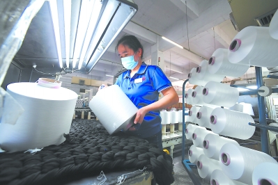 2月20日,福建錦興集團(tuán)員工在對(duì)滌綸加工絲產(chǎn)品進(jìn)行合格檢查。晉江市外來(lái)人口超過(guò)百萬(wàn),當(dāng)?shù)丶訌?qiáng)返崗員工健康管理,確保有序上工上崗。姜克紅 攝