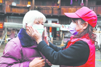 南靖縣書洋鎮志愿服務隊到楓林村示范口罩的正確戴法。福建日報記者林輝 通訊員 謝威 賴林青 攝