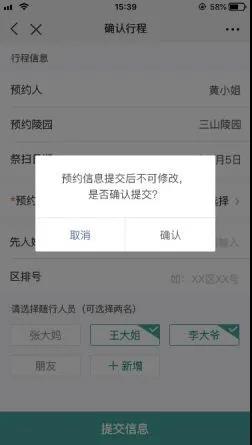 主預約人,最多可攜帶2名隨行人員,信息提交,預約成功后不可修改。3名人員前往時都需攜帶身份證原件,未成年不得參與祭掃。