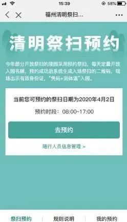 從3月25日起,每天的8:00-17:00可登錄“e福州”APP預約第二天的祭掃,選擇祭掃陵園和時間段(6:00-9:00、10:00-12:00、13:00-15:00、16:00-18:00),填寫祭掃人員身份信息(每臺墓位限預約1次,祭掃人員限成年人且不超過3人)。祭掃時段間隔1個小時,為陵園清潔、消毒時間。