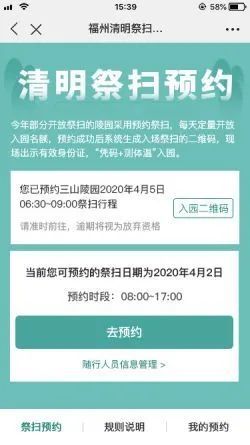 5、預約成功后,將在祭掃預約首頁生成入園二維碼,請在入園時出示。同時進入頁面也會顯示已預約的信息。