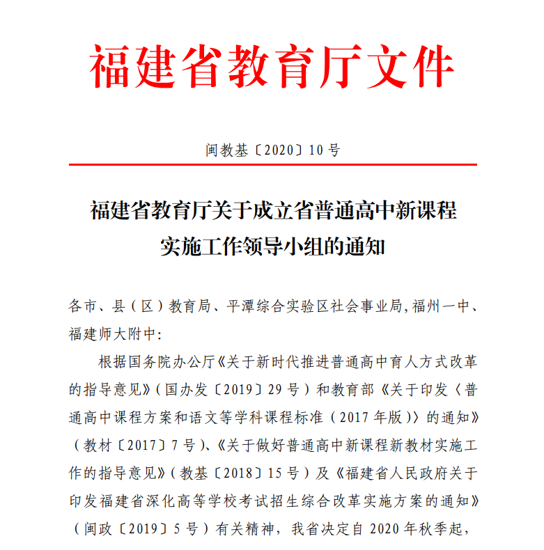 福建普通高中起始年級