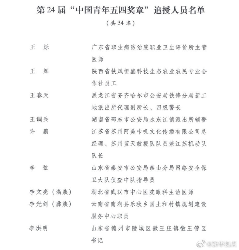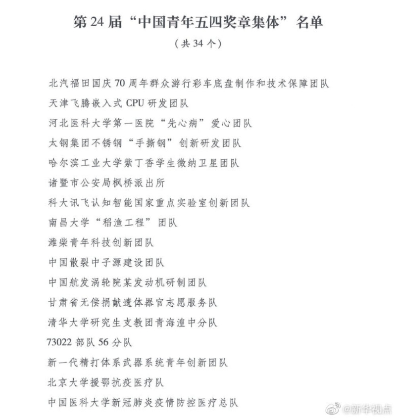 在五四青年節來臨之際,共青團中央、全國青聯共同頒授第24屆“中國青年五四獎章”,表彰青年中的優秀典型和模范代表。決定授予丁良浩等60名同志第24屆“中國青年五四獎章”,授予北汽福田國慶70周年群眾游行彩車底盤制作和技術保障團隊等34個青年集體第24屆“中國青年五四獎章集體”,追授王爍等34名同志第24屆“中國青年五四獎章”。
