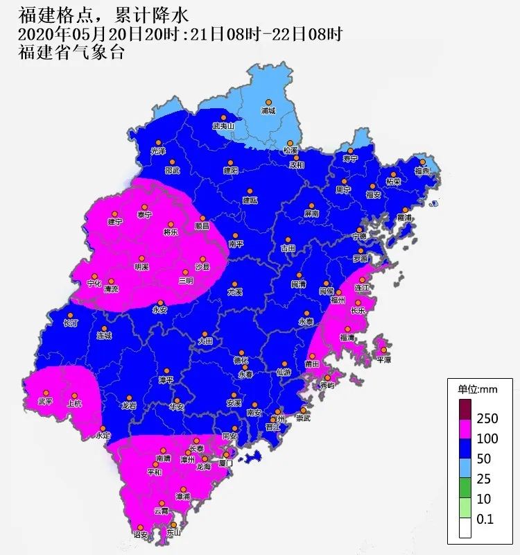 21—22日福州市將有強降雨過程,預計全市過程累積雨量(21日08時至23日08時)為90~130毫米,局部超過150毫米;福州市區過程累積雨量為90~120毫米,局部街道超過130毫米。主要降雨時段為21日下午到22日白天。最大小時雨強為30~50毫米。